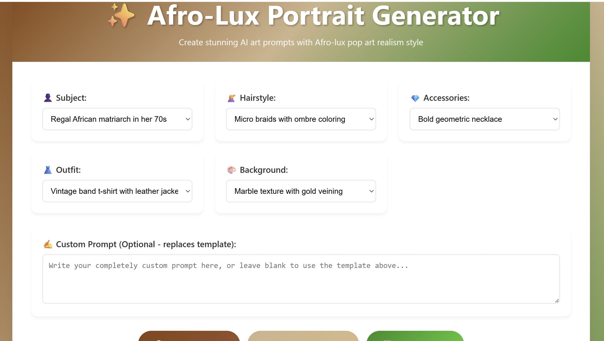 - Pre-filled Afro-Lux prompt components