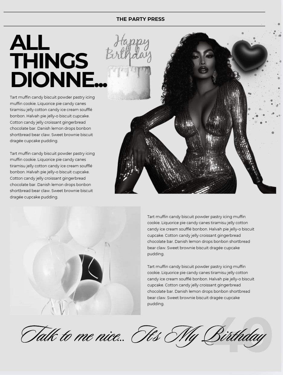 Black & White Design: Classic and elegant, this design mimics an authentic newspaper and is perfect for adult birthdays.
