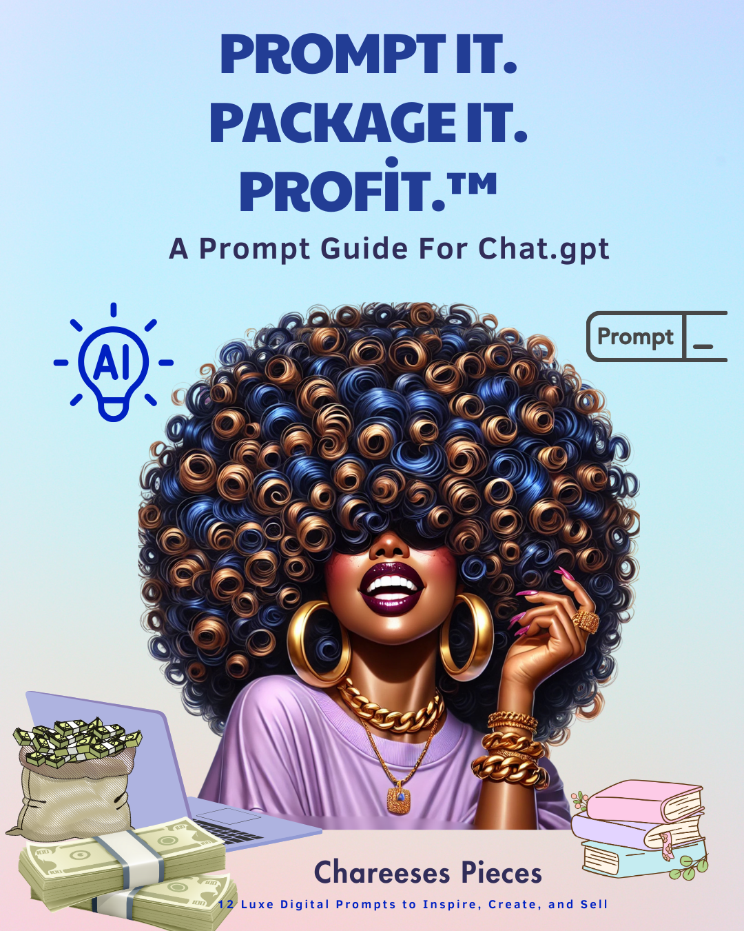 Prompt It. Package It. Profit.™ is a beautifully designed 12-page eBook featuring done-for-you digital art prompts, playful captions, and profit-minded guidance to help you create, style, and start selling.