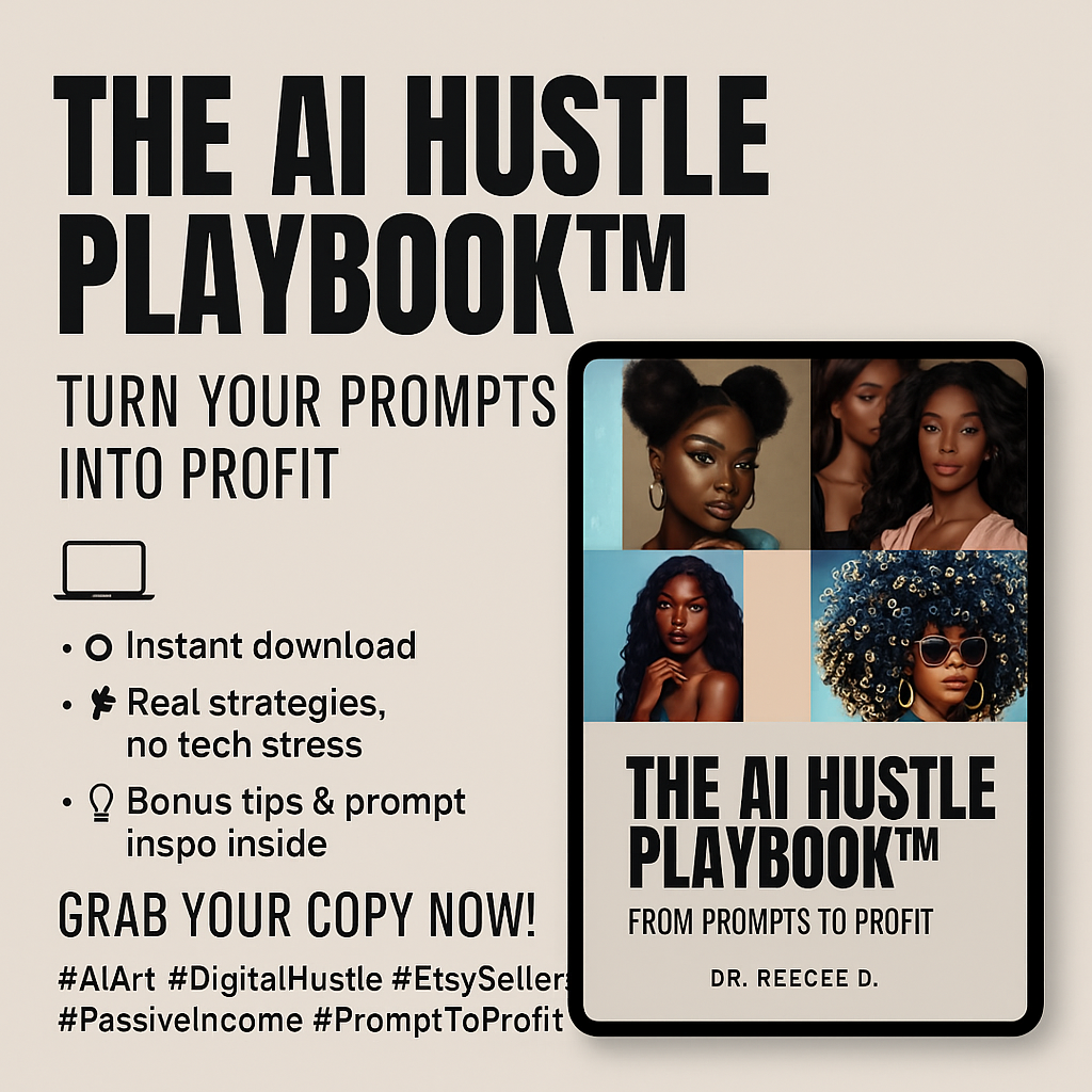 Ready to turn AI art into real income? The AI Hustle Playbook™ by Dr. Reecee D. is your step-by-step guide to building passive income through prompt-based creativity—without the tech stress.